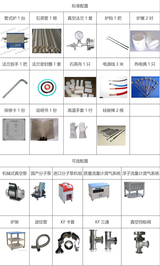 主機(jī)1臺(tái),密封法蘭1套,“O”型圈4個(gè),石英管1根,管堵4個(gè),坩堝鉤1把, 說明書、合格證、保修卡各1份 |